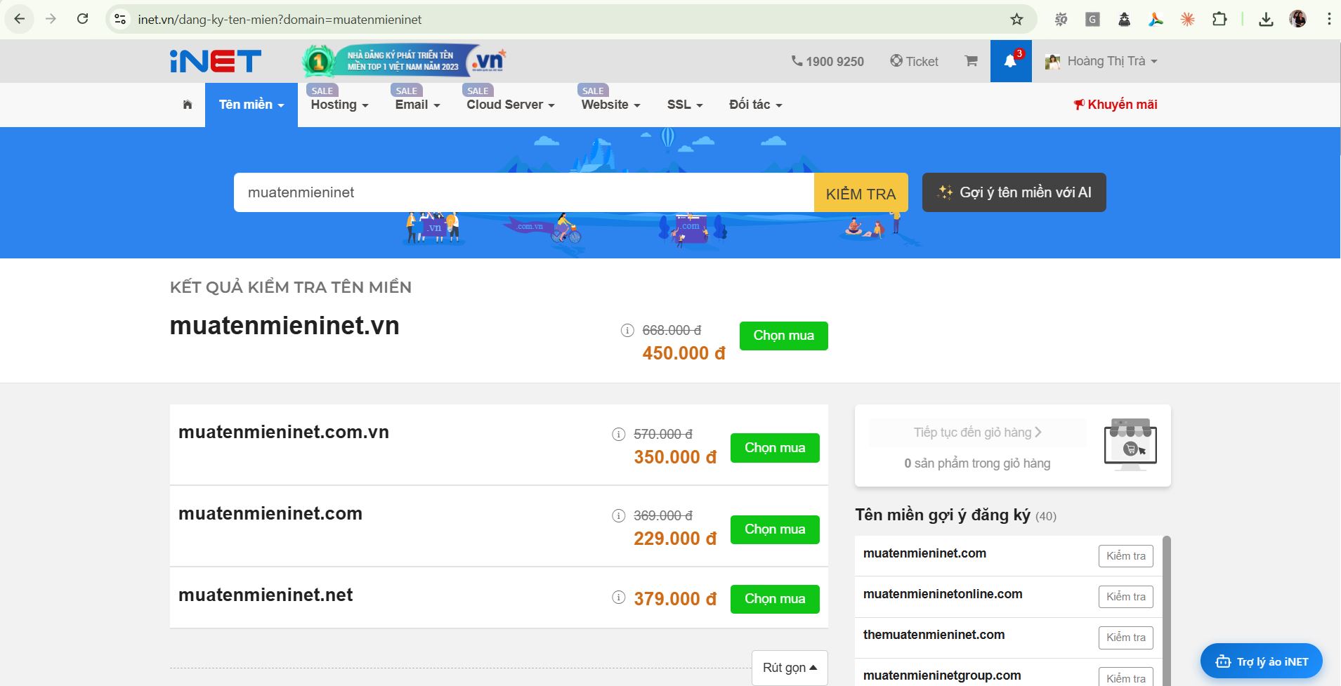 Danh sách các tên miền kèm các đuôi sẽ hiện ra. Tên miền nào còn trống sẽ hiển thị nút xanh Chọn mua, bạn chỉ cần lựa chọn cho mình tên miền phù hợp nhất cho vào giỏ hàng và thanh toán nhé.